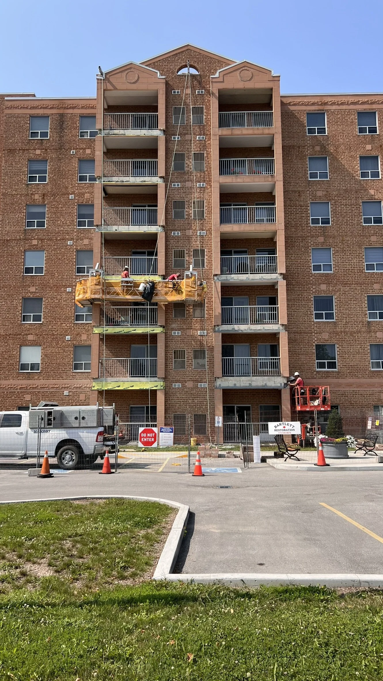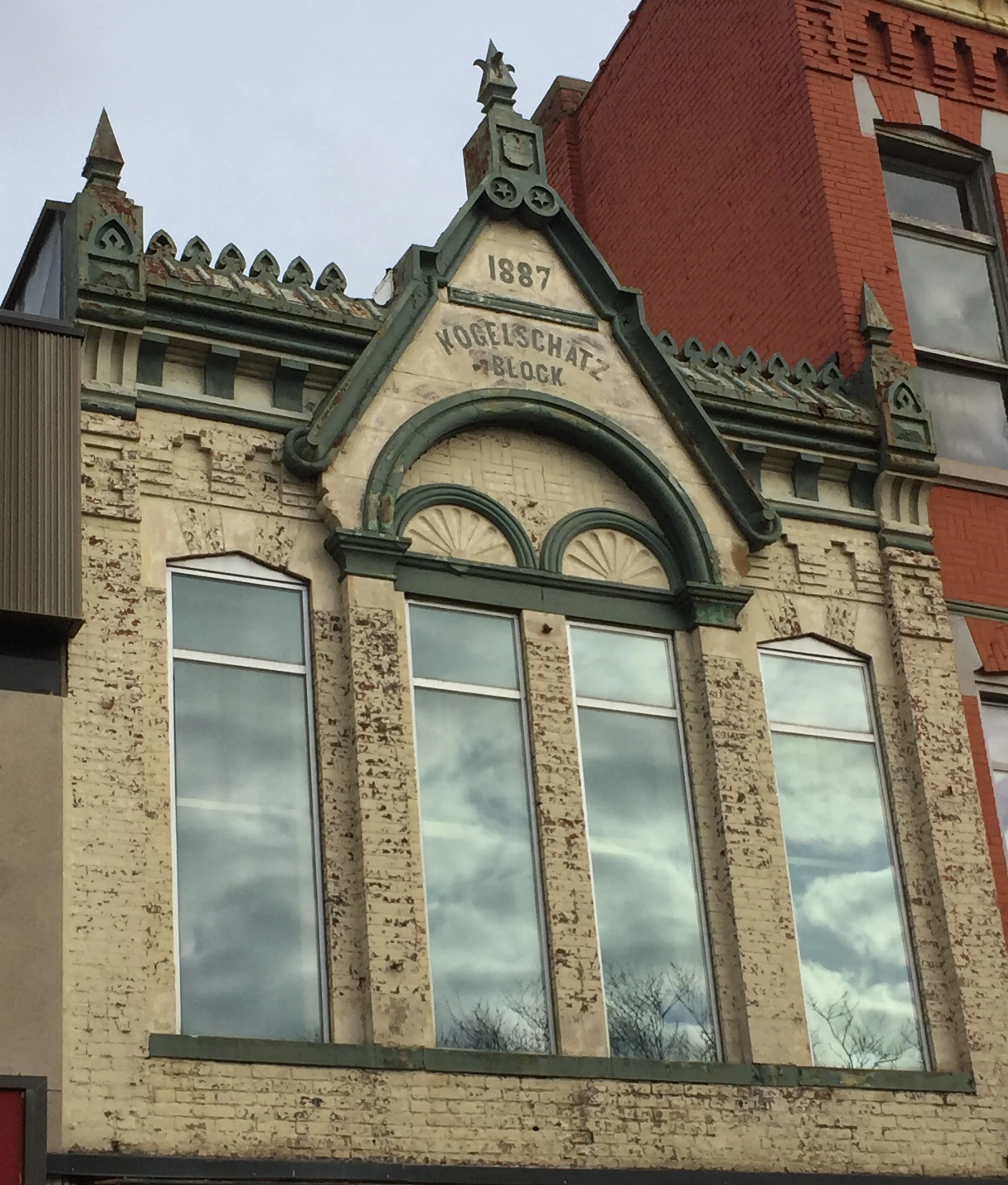 Restoration of exterior parapet metal, stone, and top portion of brick.